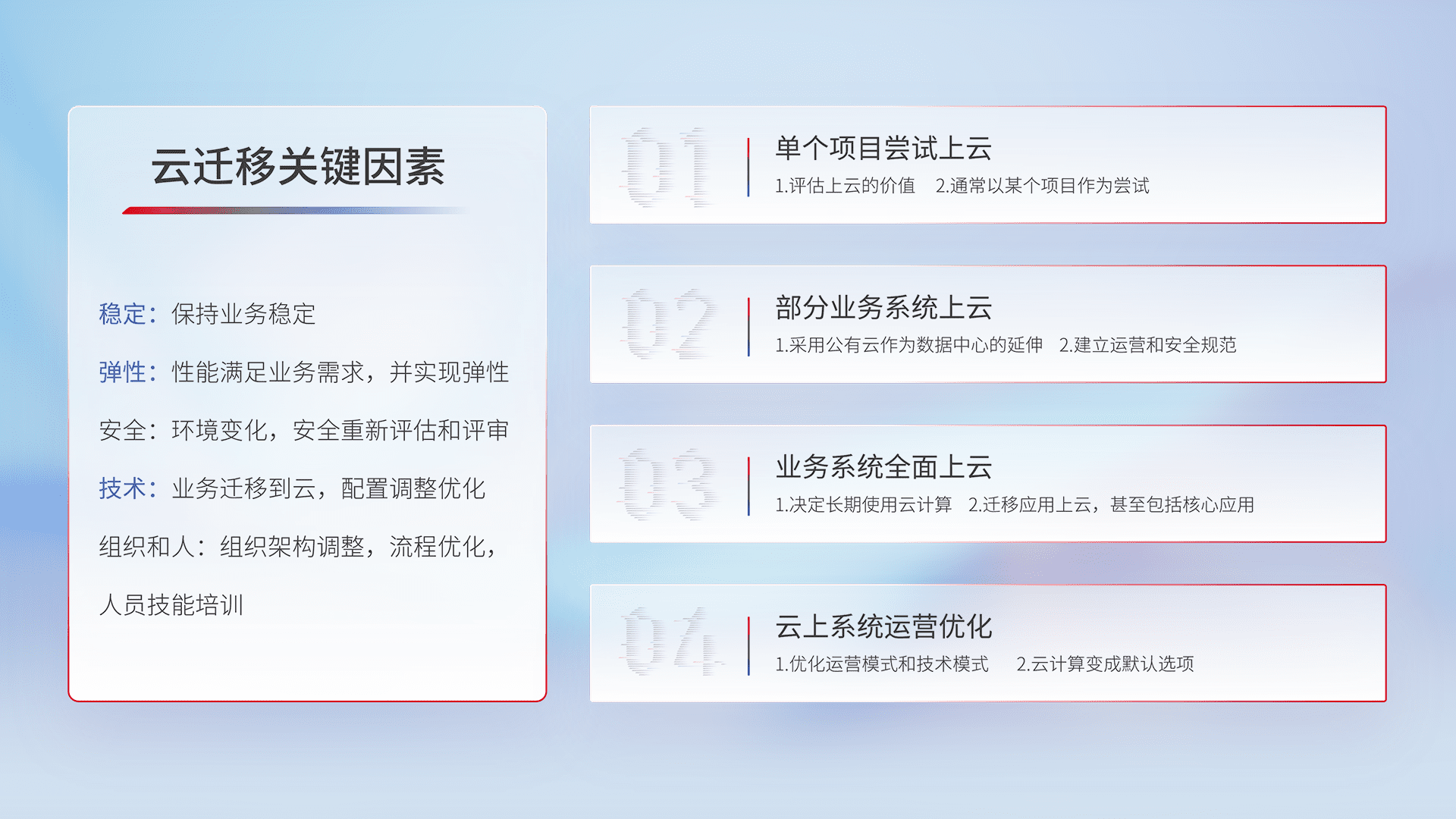 结合实际业务,,从规划设计、、、云平台选型、、、、云原生改造、、、、数据迁移、、、集成交付,,,,迁移全过程为客户识别最佳上云路径,,,做好风险识别管理,,,设计网络架构、、身份权限、、安全审计合规、、操作审计、、、、日志审计、、监控告警策略、、、多站点容灾设计等,,对云上基础设施进行整体规划,,提升IT治理水平,,以满足弹性、、高可用、、、高性能的需求。。。。