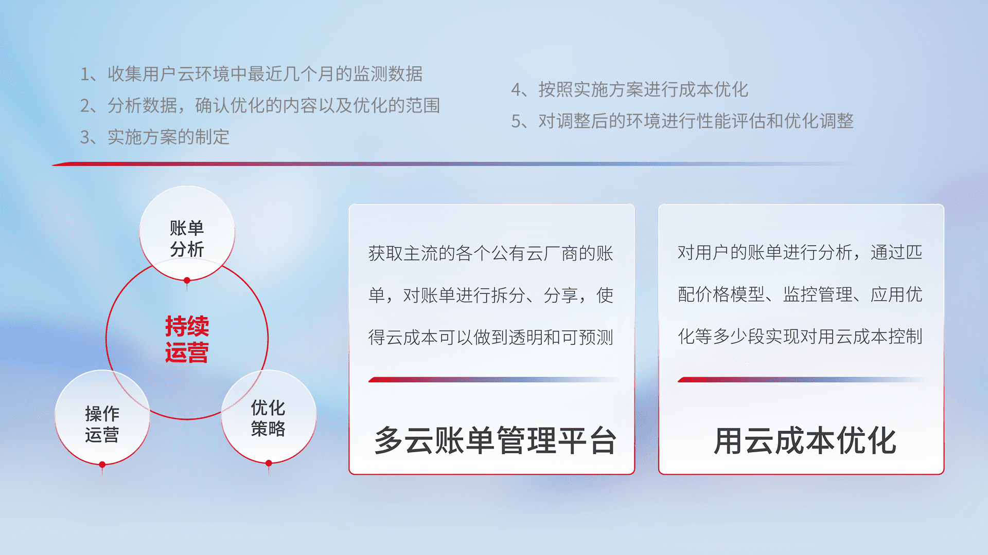 通过多云纳管,,,以统一的资源数据模型把客户的云资源进行抽象和封装,,,,进而实现对多云资源的统一操作,,保障云资源管理的可靠性、、稳定性与可用性。。。。量身定制化运维内容,,,配置、、、、开发运维、、、、补丁管理、、备份、、、、监控、、认证和访问管理、、、审计和日常巡检等,,,,保障在用云过程中的可靠度,,,稳定度以及高可用率。。